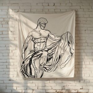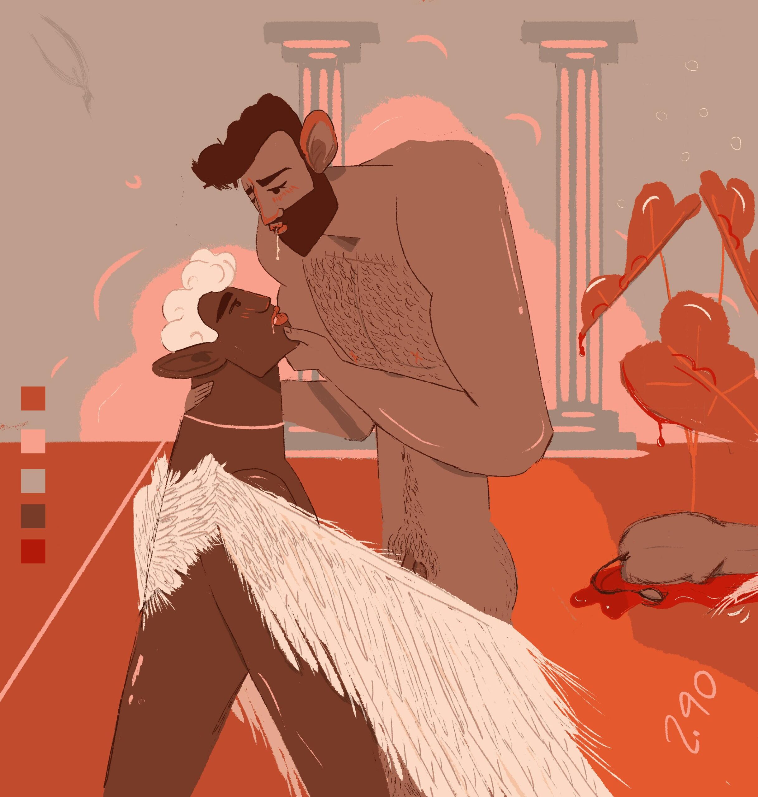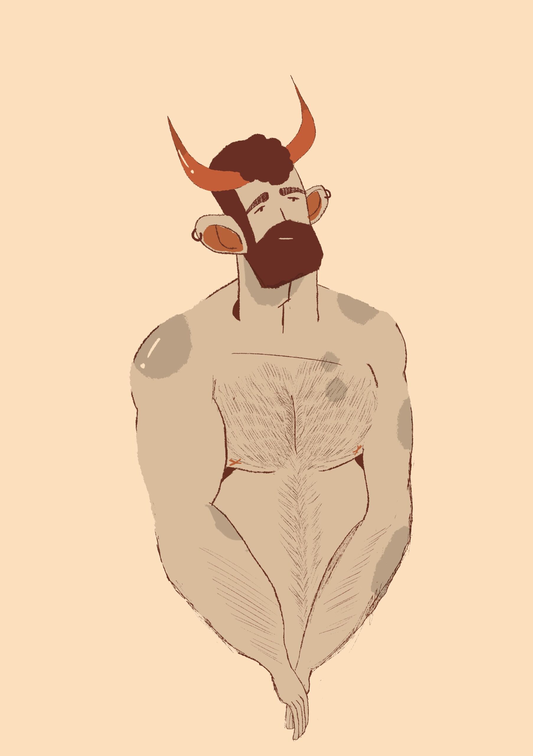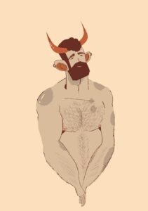 Muscular, robust figures are illustrated within dense, wild vegetation, using a warm brown-orange palette.