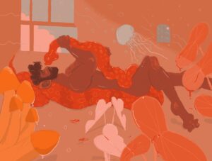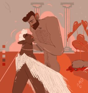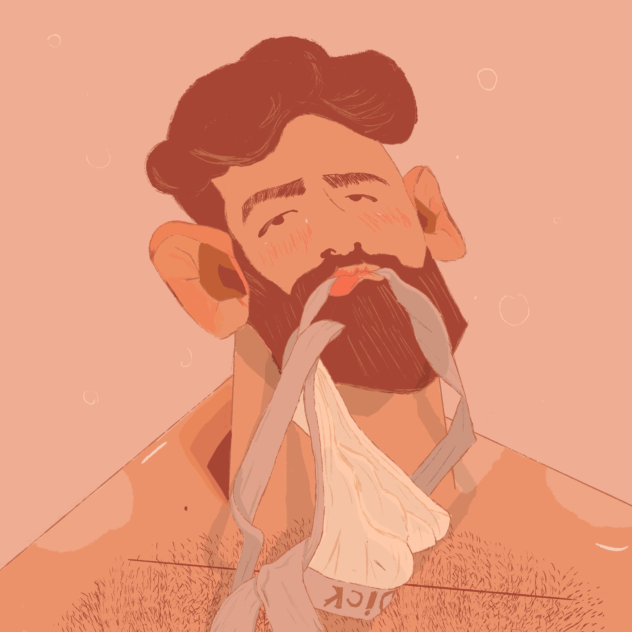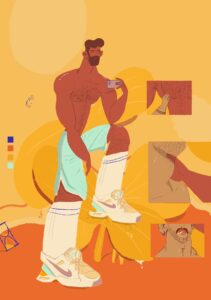 His digital illustrations depict scenes from his everyday natural surroundings: a secular Arab Tel Avivian in a relationship, living with two dogs.